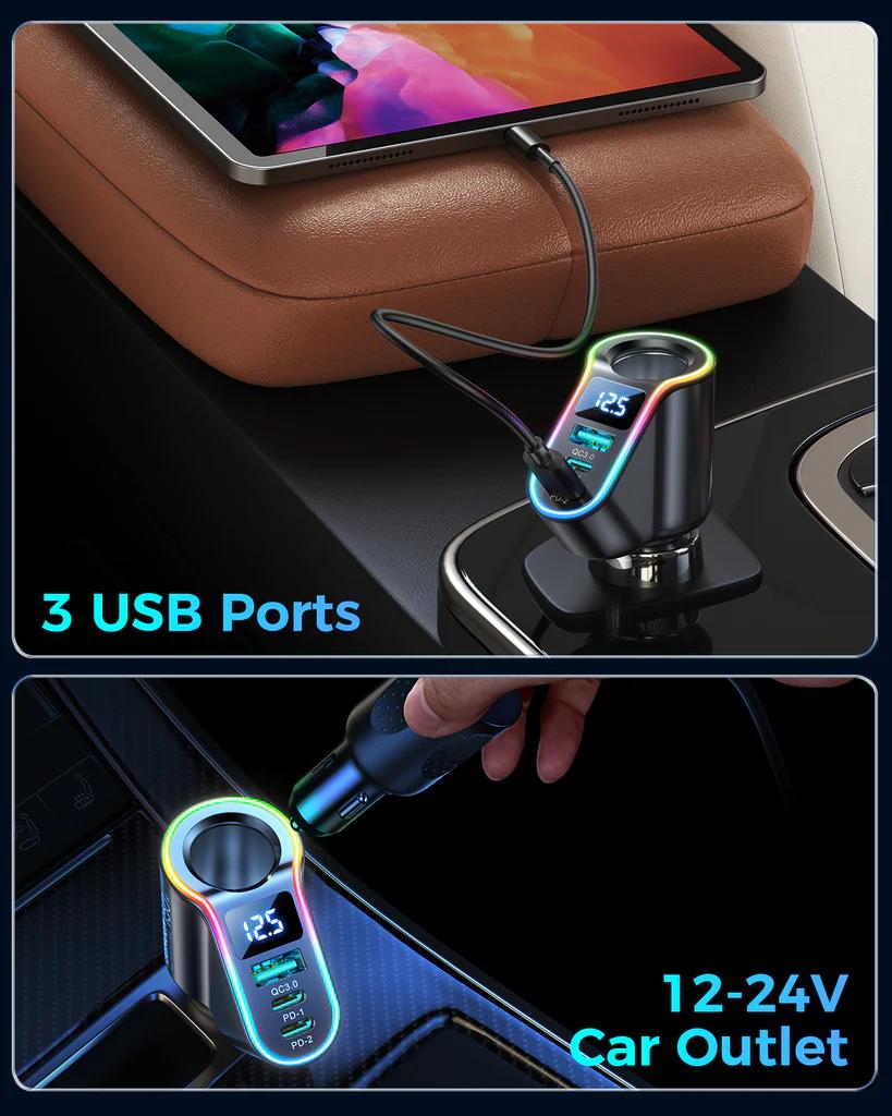 หัวชาร์จในรถ 4 ช่อง JR-CL21 150W 4-in-1 Car Charger Multi-port QC3.0+PD Fast Car Charger Adapter Joyroom JR-CL21 4in1 Car Charger PD3.0+QC3.0 150W หัวชาร์จในรถยนต์ 2 ช่อง PD2.0 +1 USB QC3.0 จ่ายไฟรวมสูงสุดที่ 150W พร้อม Socket มาพร้อมจอ LCD แสดงค่ากระแสไฟ รองรับไฟขนาด 12V.-24V. สำหรับ มอเตอร์ไซด์ รถยนต์ และรถบรรทุก ปลอดภัยด้วยชิพป้องกันการลัดวงจร จ่ายไฟนิ่ง และ เสถียร Input: DC 12-24V QC3.0 output: 5V=3A 9V=2A 12V=1.5A 20V=1.5A PD-1 output: 5V=3A 9V=3A 12V=2.5A 15V=2A 20V=1.5A PPS: 3.3-11V=3.0A (Max) QC3.0+PD-1 output: 5V= 4A PD-2 output: 5V=3A 9V=3A 12V=2.5A 15V=2A 20V=1.5A PPS: 3.3-11V=3.0A (Max) Expansion socket: 90W Total output: 150W Size: 99*63*35mm Net weight: 51g JOYROOM JR-CL21 150W Fast Charger QC+PD 4 in 1 USB+Type-C Charger with LED Digital Display JOYROOM JR-CL21 150W Fast Charger QC+PD 4 in 1 USB+Type-C Charger with LED Digital Display Our car charger adapter with 1 USB + 2 Type-C port and 12V/24V socket, allows multiple devices to be charged simultaneously The socket splitter won't occupy the car's original car socket, supports simultaneous use and fits for most in-car portable appliances such as GPS, handheld vacuum cleaner and electric air pump, seat heater, humidifier, DVD player in your 12V/24V vehicle Small and lightweight design increases portability and allows for easy installation in a socket where space is limited Colorful light ring helps to locate ports when it is dark Specifications: Input: DC 12-24V QC3.0 Output: 5V=3A 9V=3A 12V=2.5A 20V=1.5A PD-1 output: 5V=3A 9V=3A 12V=2.5A 15V=2A 20V=1.5A PPS: 3.3-11V=3.0A(Max) QC3.0+PD-1 output: 5V=4A PD-2 output: 5V=3A 9V=3A 12V=2.5A 15V=2A 20V=1.5A PPS: 3.3-11V=3.0A(Max) Total output: 60W(Max) Car socket: 90W(Max) Material: PC Compatible with: Universal Package included: 1 x Car Charger 1 x English and Chinese User Manual