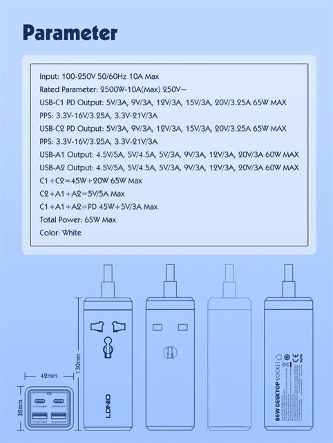 หัวชาร์จ 65W LDNIO SC1418 Multifunction Universal Power Adapter หัวชาร์จพร้อมปลั๊กยาว 2 เมตร รองรับPD3.0 and QC3.0 fast charging ชาร์จได้ทุกรุ่น มีระบบป้องกันโอเวอร์โหลด กันไฟกระชาก รองรับการใช้งานแบบหนักๆ heavy-duty Input 100-250V/10A, 2500W(Max) USB-C1/C2 Output 5V/3A, 9V/3A, 12V/3A, 15V/3A, 20V/3.25A 65W Max PPS 3.3V-16V/3.25A, 3.3V-21V/3A USB-A1/A2 Output 4.5V/5A, 5V/4.5A, 5V/3A, 9V/3A, 12V/3A, 20V/3A 60W Max C1+C2 45W+20W 65W Max C2+A1+A2 5V/5A Max C1+A1+A2 PD 45W+5V/3A Max Total Power 65W Max 65W Multifunction Universal Power Adapter SC1418 LDNIO SC1418 65W PD Adapter Multifunction Chargers Power Strip with USB Ports Type C 200cm Extension Socket Power Cord Features *65W high power, Charge fast for tablets and phones which support PD3.0 and QC3.0 fast charging protocol. *Output 2500W, suitable for: any size of household appliances and mobile devices. *2M heavy-duty power cord can flow optimal power to connected devices. *Simultaneously helps to protect multiple-electronic devices while accommodating large adapters. Model SC1418 Input 100-250V/10A, 2500W(Max) USB-C1/C2 Output 5V/3A, 9V/3A, 12V/3A, 15V/3A, 20V/3.25A 65W Max PPS 3.3V-16V/3.25A, 3.3V-21V/3A USB-A1/A2 Output 4.5V/5A, 5V/4.5A, 5V/3A, 9V/3A, 12V/3A, 20V/3A 60W Max C1+C2 45W+20W 65W Max C2+A1+A2 5V/5A Max C1+A1+A2 PD 45W+5V/3A Max Total Power 65W Max ![]() ![]() ![]() ![]() ![]() ![]() ![]() ![]() ![]() ![]() ![]() ![]() ![]() ![]() |